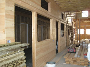 Below left, the front of the New Main barn ; to the right, interior starts to take shape.